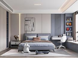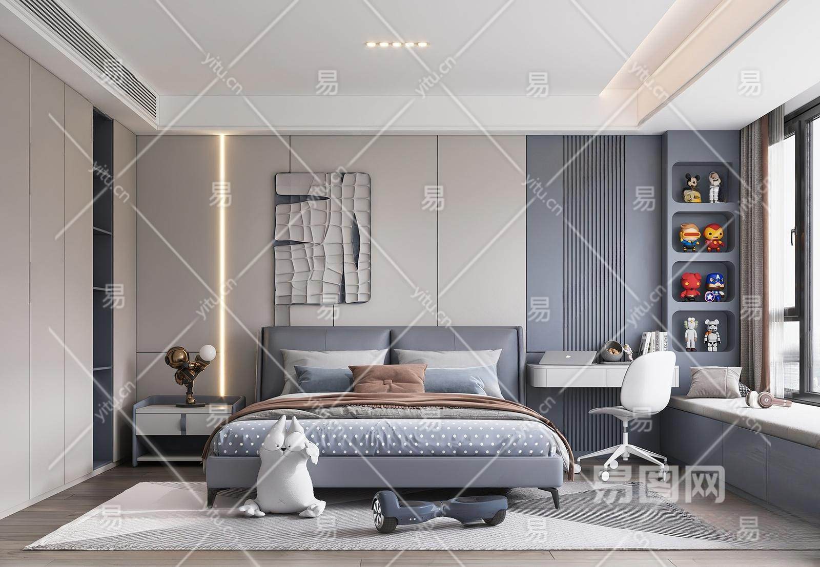 现代男孩房 背景墙 衣柜 装饰柜 写字桌 椅子 装饰品摆件 玩偶乐高公仔
