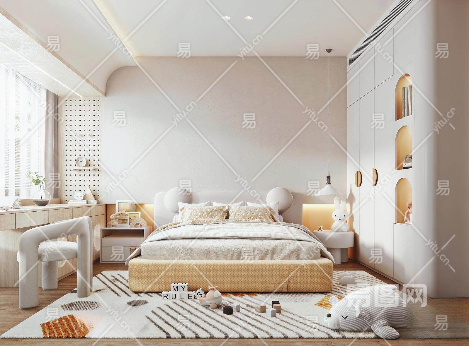 现代通用儿童房 双人床 书桌 椅子 床头柜 边几 衣柜 吊灯 饰品摆件