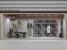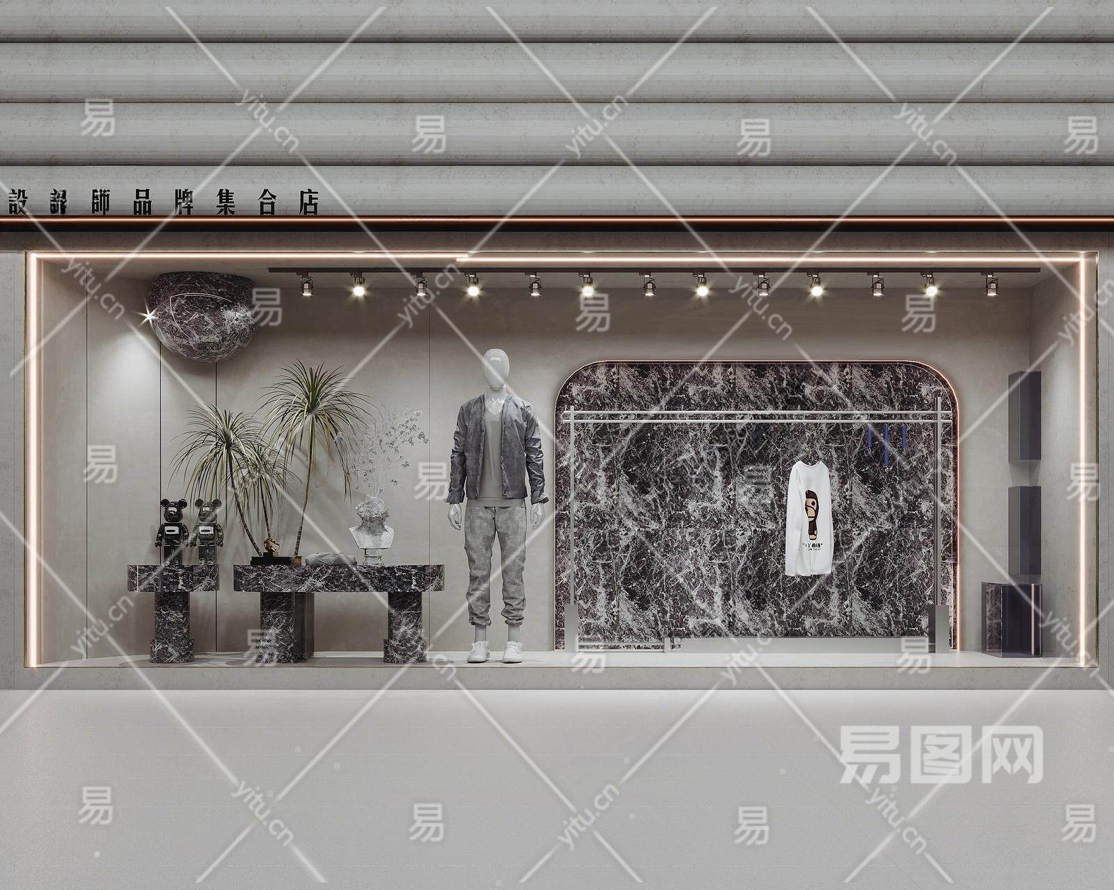侘寂风服装店橱窗 服装货架 大理石展台 门面招牌 模特假人