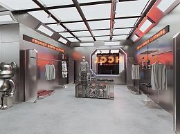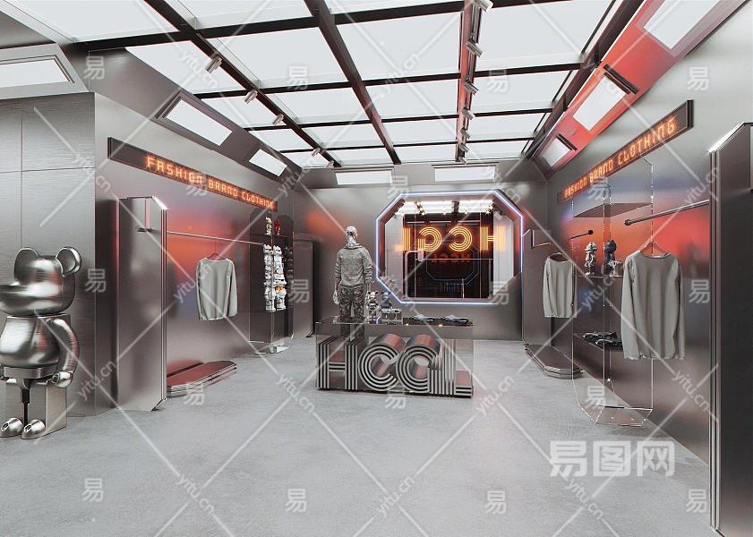 现代潮牌男装服装店 服装货架 玻璃展台 模特 暴力熊