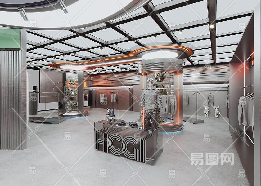 现代潮牌男装服装店 服装货架 玻璃展台 模特 暴力熊