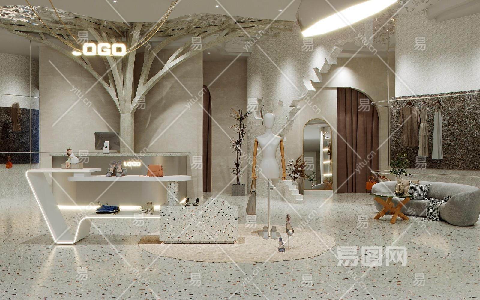 侘寂风服装店 女装店 服装货架 中岛展台 模特 衣架