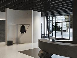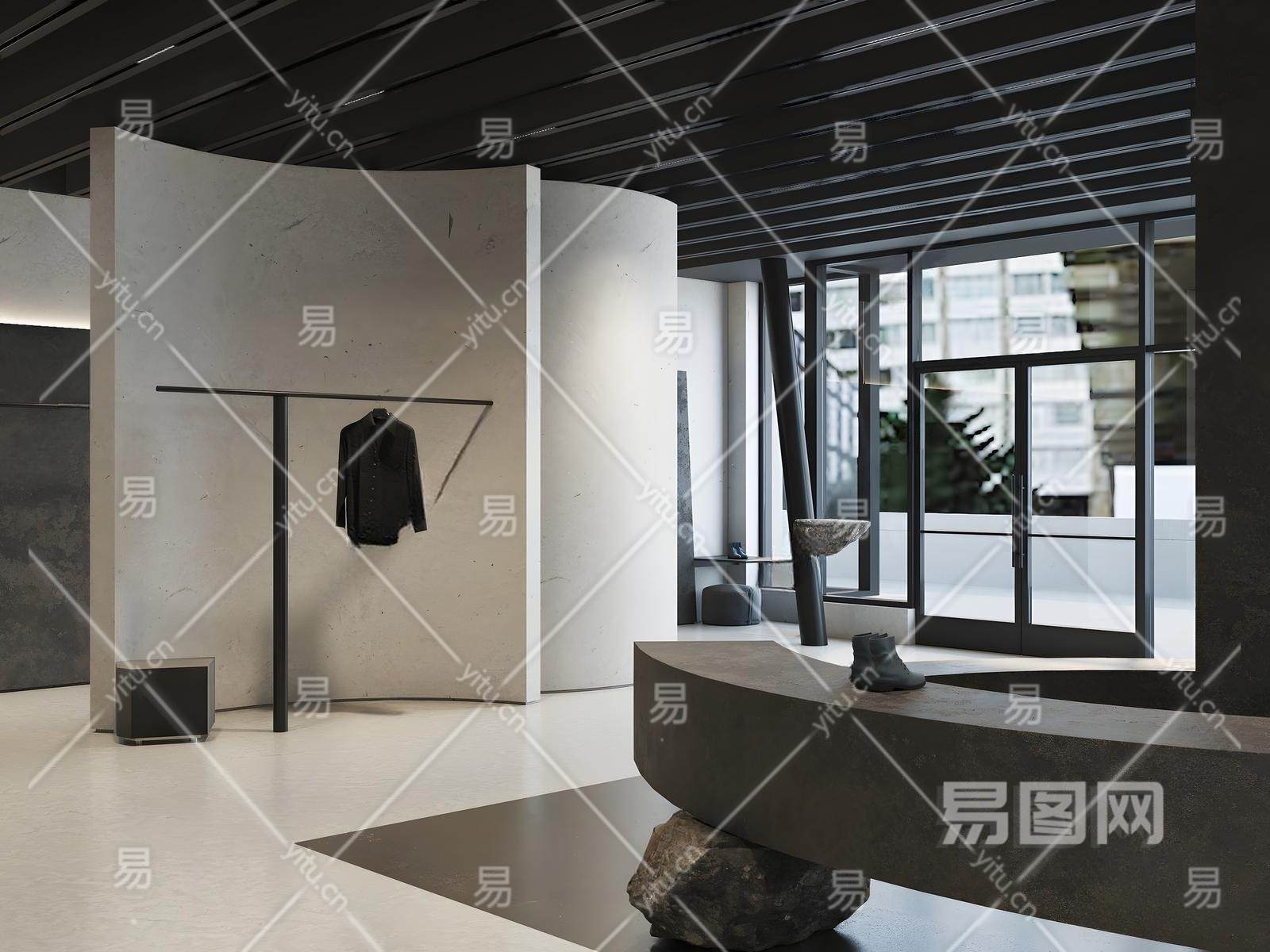 现代极简服装店 石制座椅 衣服展示架