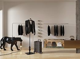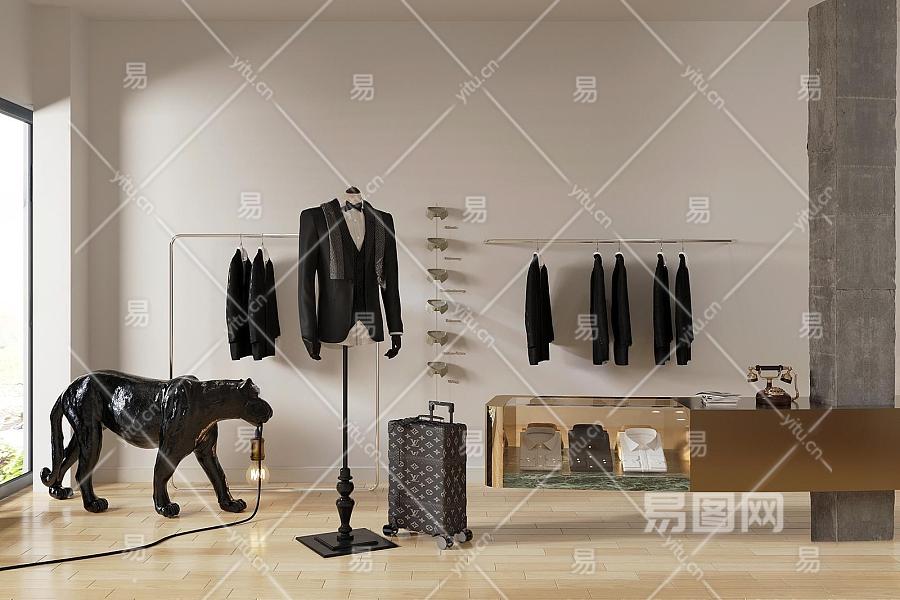 现代西装店展示区 西装模特 西装橱窗 复古电话 灯饰摆件
