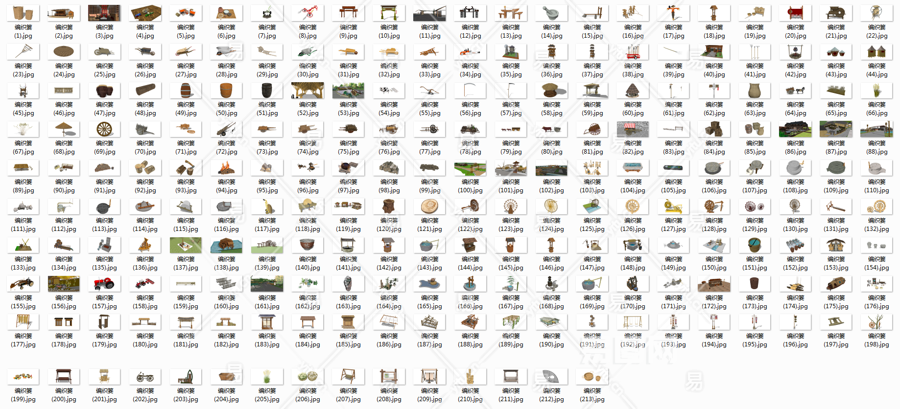 35中式乡村田园农具 编织篓 小品 摆件耕地农具 谷仓 石墨 拖拉机 耙子 稻草人 脱稻机 农家板车 耕犁牛 酒桶 镰刀 茅草屋 磨盘 车轮子 农家院 乡村农忙用具su草图模型下载