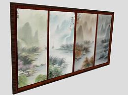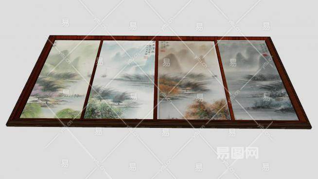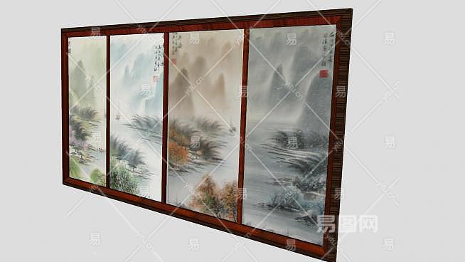 中国山水画四联挂画SU模型下载_sketchup草图大师SKP模型