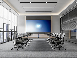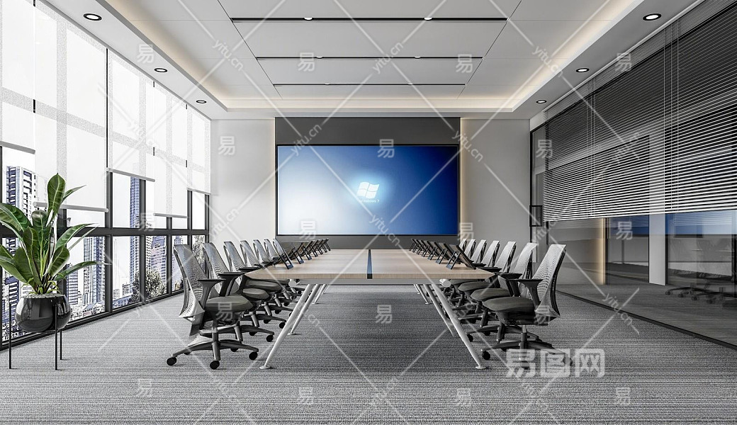 现代会议室 会议桌椅 显示屏 盆栽 卷帘