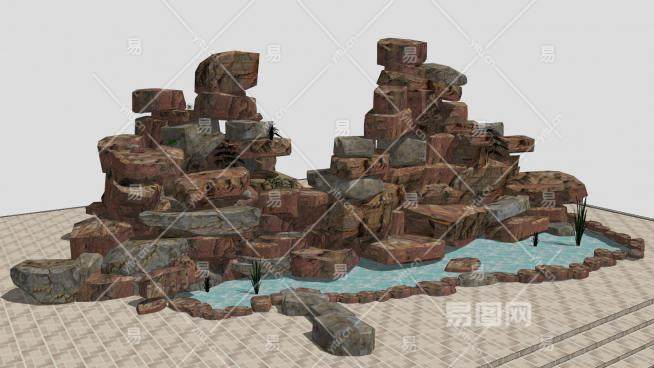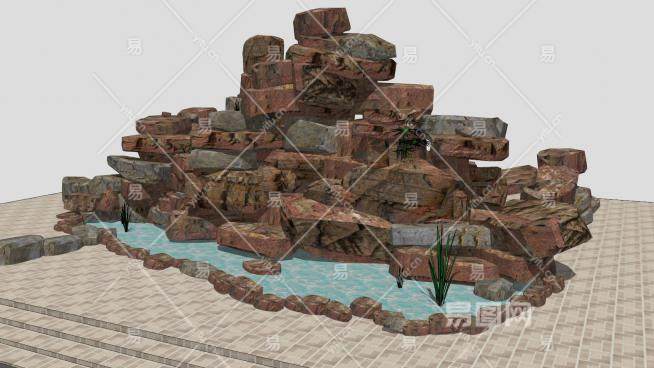 落水岩石假山水景地SU模型下载_sketchup草图大师SKP模型