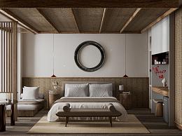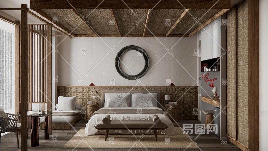 新中式民宿客房 酒店客房 双人床 柜子 双人沙发