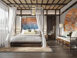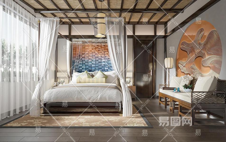 新中式民宿客房 酒店客栈 斜顶 宾馆客房 架子床 罗汉椅 休闲椅