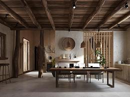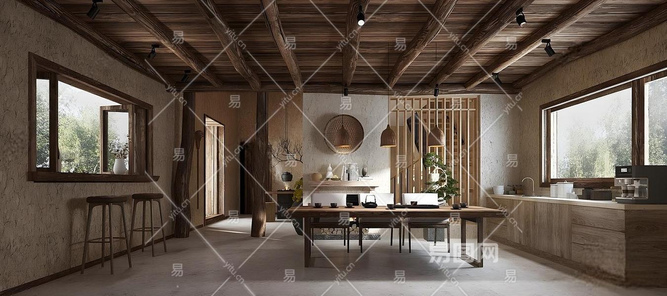 侘寂风民宿内部 吊灯 茶桌 绿植 装饰柜