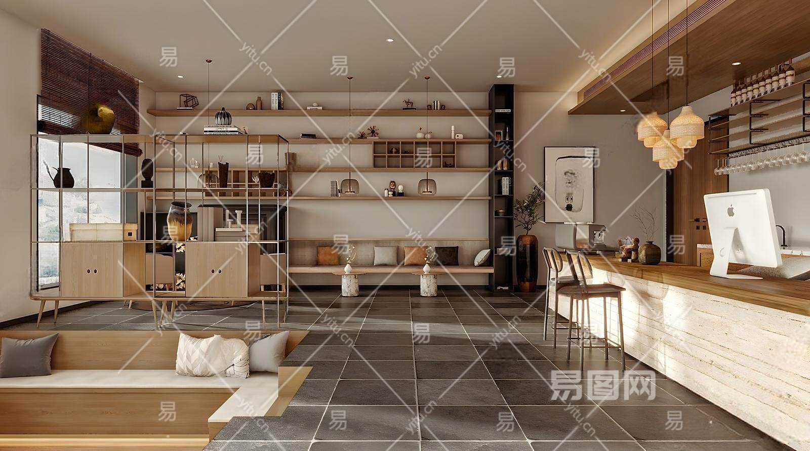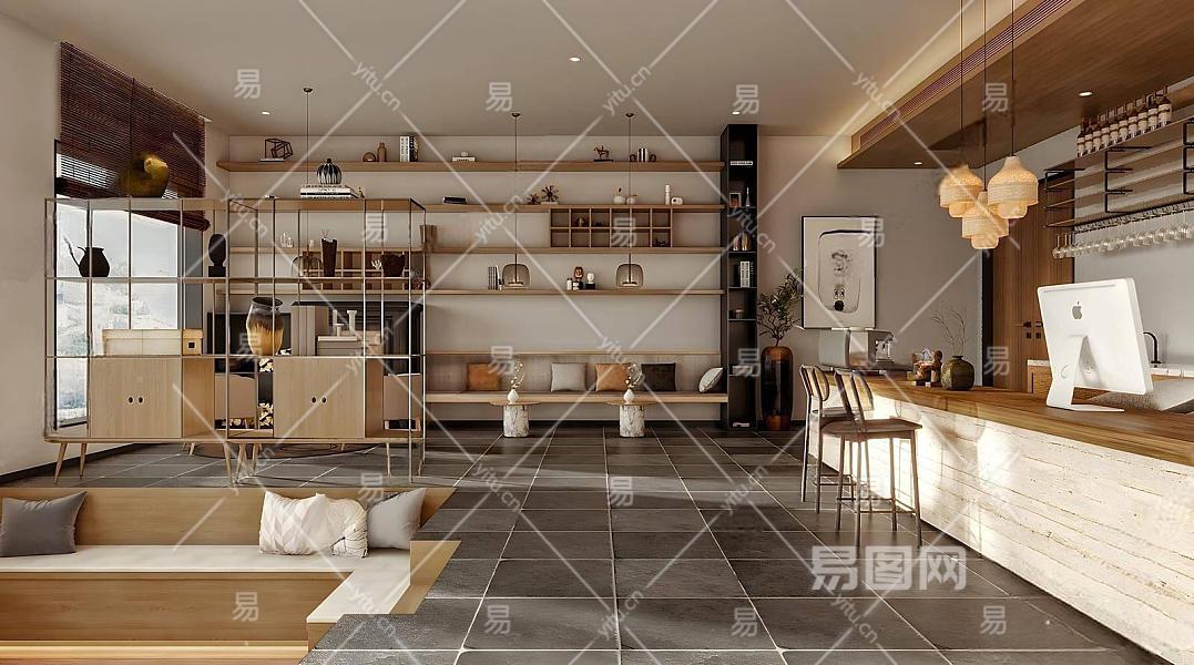 侘寂风民宿酒店大堂 前台 摆件组合 下沉沙发