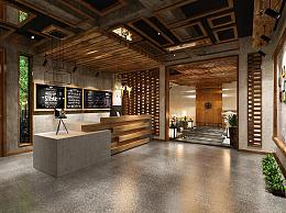 工业新中式民宿 大厅 前台 接待区 休闲区 背景墙 价格牌 大门