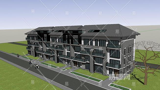 中式别墅户外联排别墅建筑SU模型下载_sketchup草图大师SKP模型