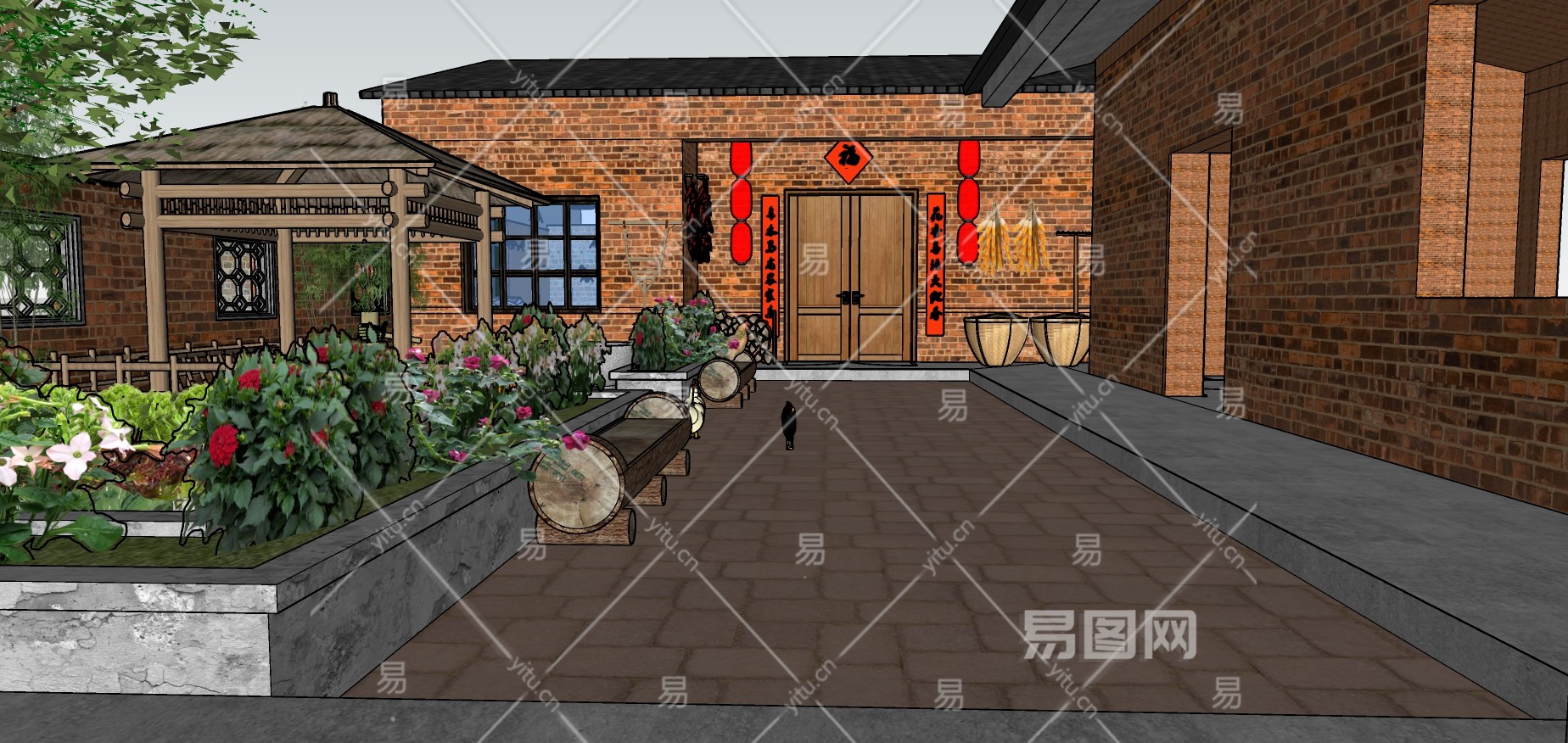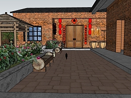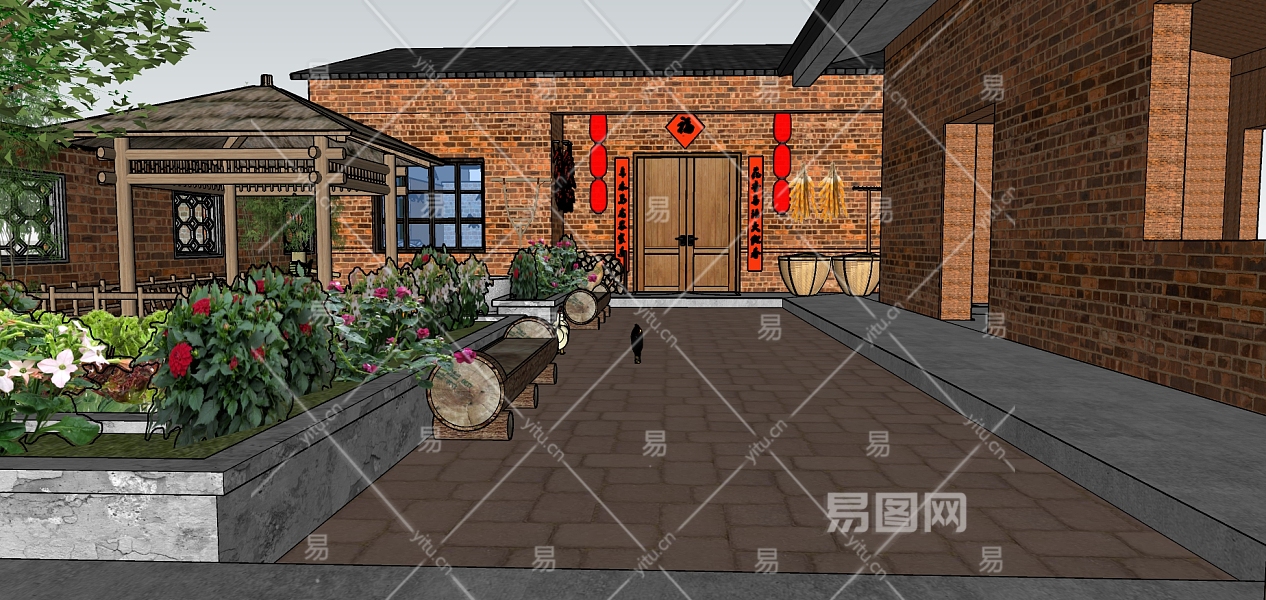 143中式乡村农家院,农村四合院,农村院子,红砖农家院,凉亭,民宿,花坛su草图模型下载