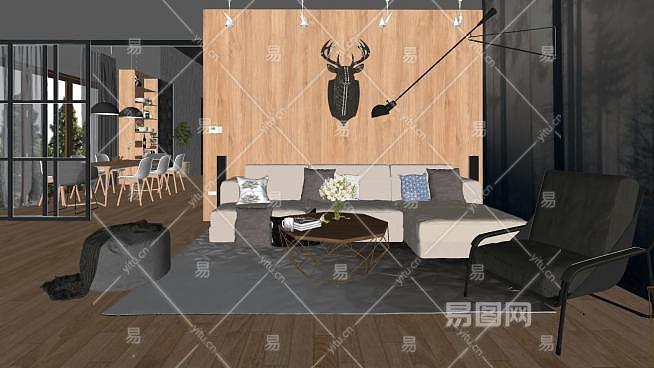 原木北欧风客餐厅SU模型下载_sketchup草图大师SKP模型