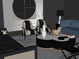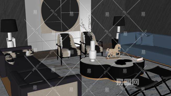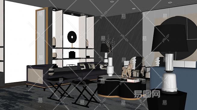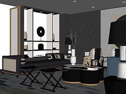 新中式简约客厅设计SU模型下载_sketchup草图大师SKP模型