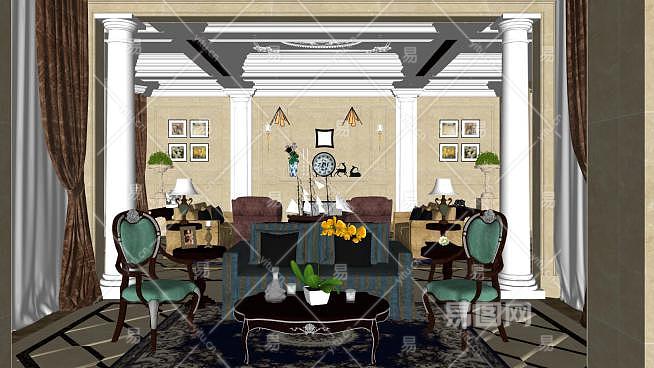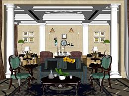复古美式客厅室内SU模型下载_sketchup草图大师SKP模型