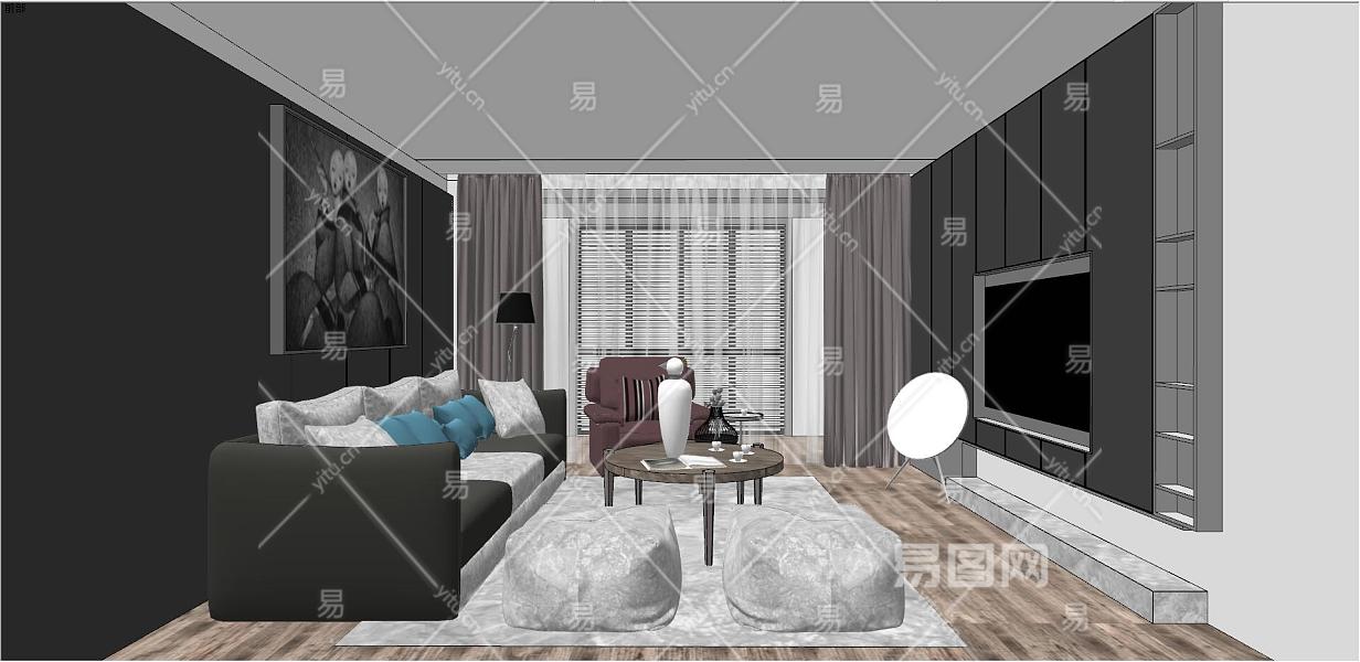016后现代简约港式客厅su草图模型下载