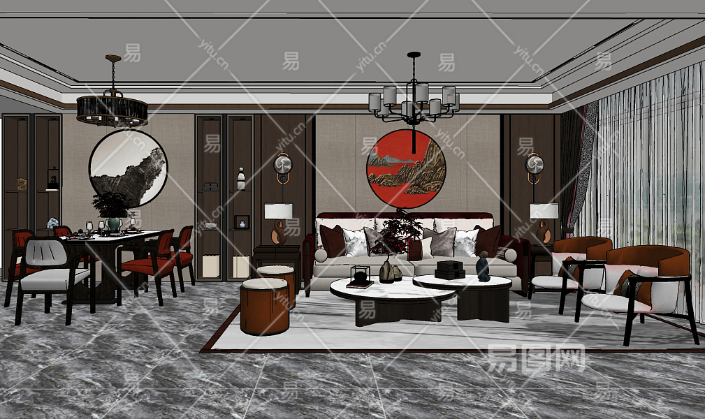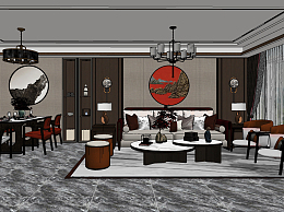 新中式客餐厅su草图模型下载