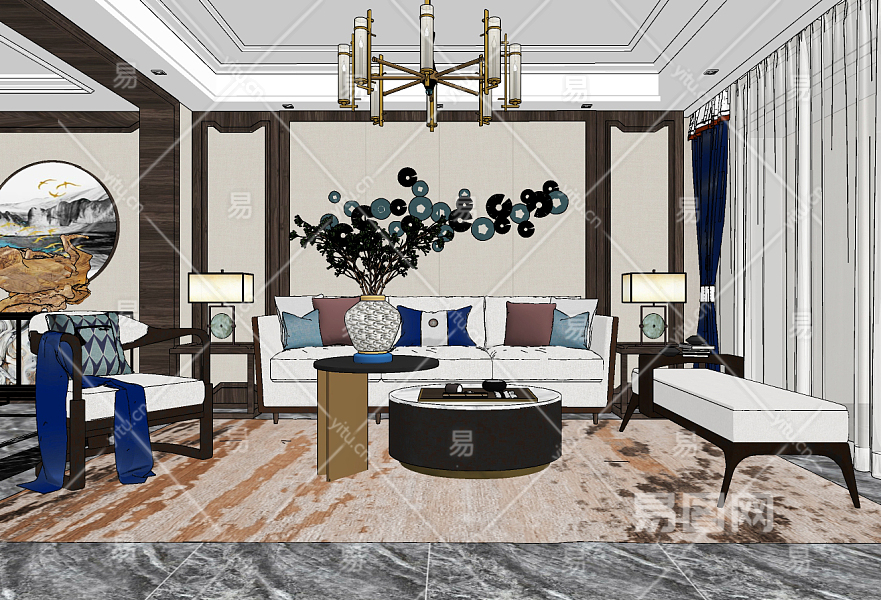 新中式简约客厅su草图模型下载