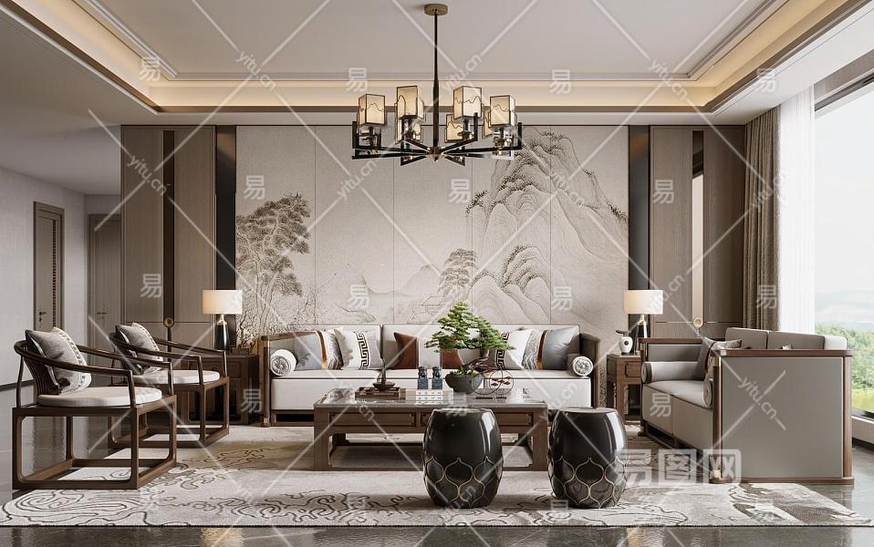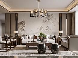 新中式客厅 沙发 圈椅 茶几 边几 墩子 吊灯 靠包 摆件 墙板