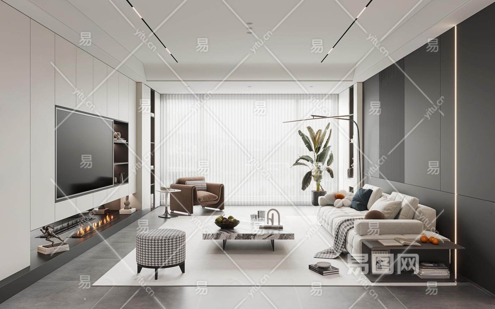 现代客厅 沙发茶几组合 单人休闲椅 书籍 公仔 绿植 饰品摆件