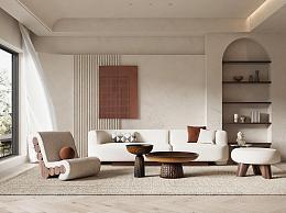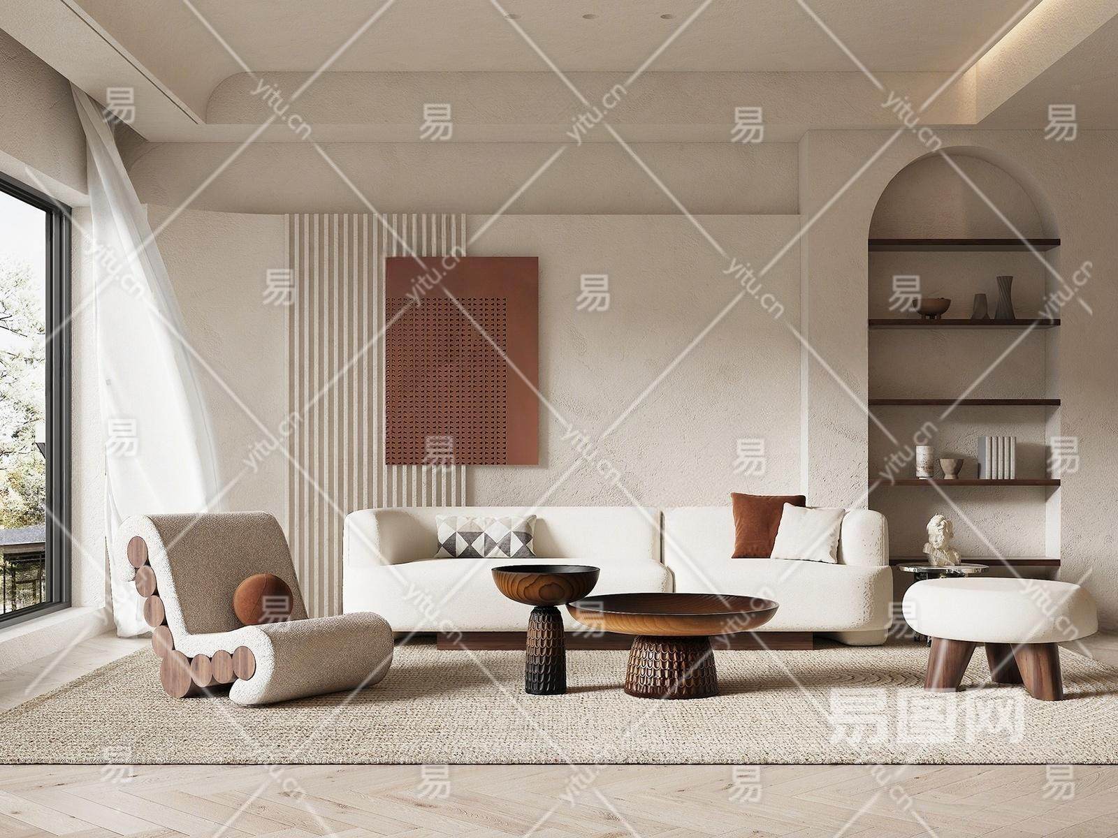侘寂客厅 客厅 沙发茶几组合 多人沙发 茶几 边柜 雕塑 休闲椅 凳子