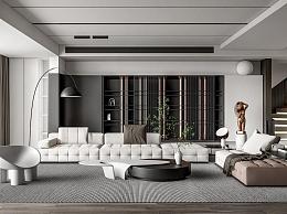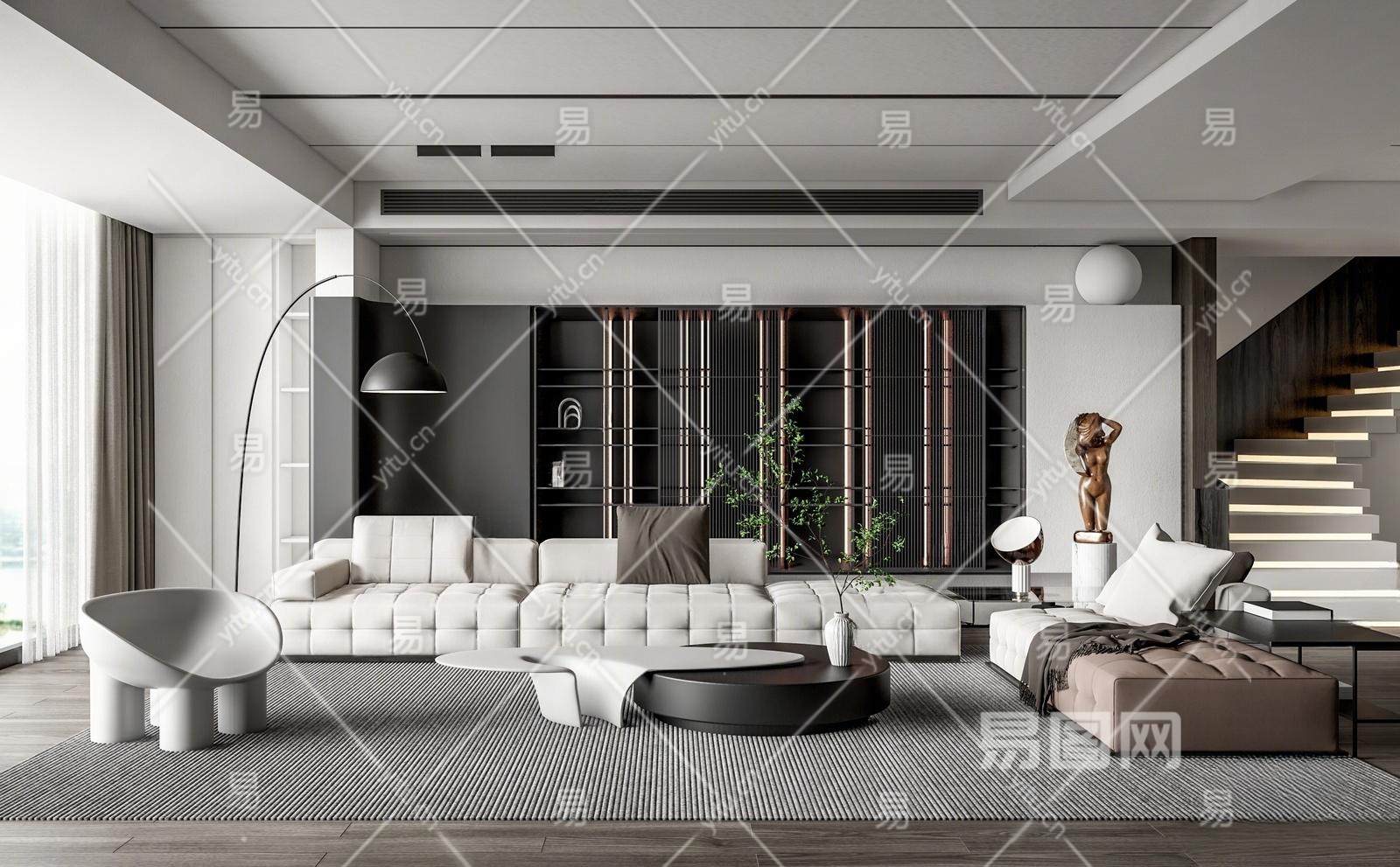 现代别墅客厅 沙发茶几组合 雕塑摆件 休闲椅 楼梯 落地灯