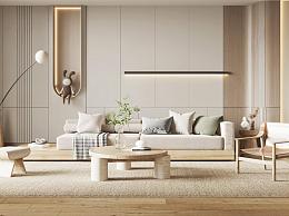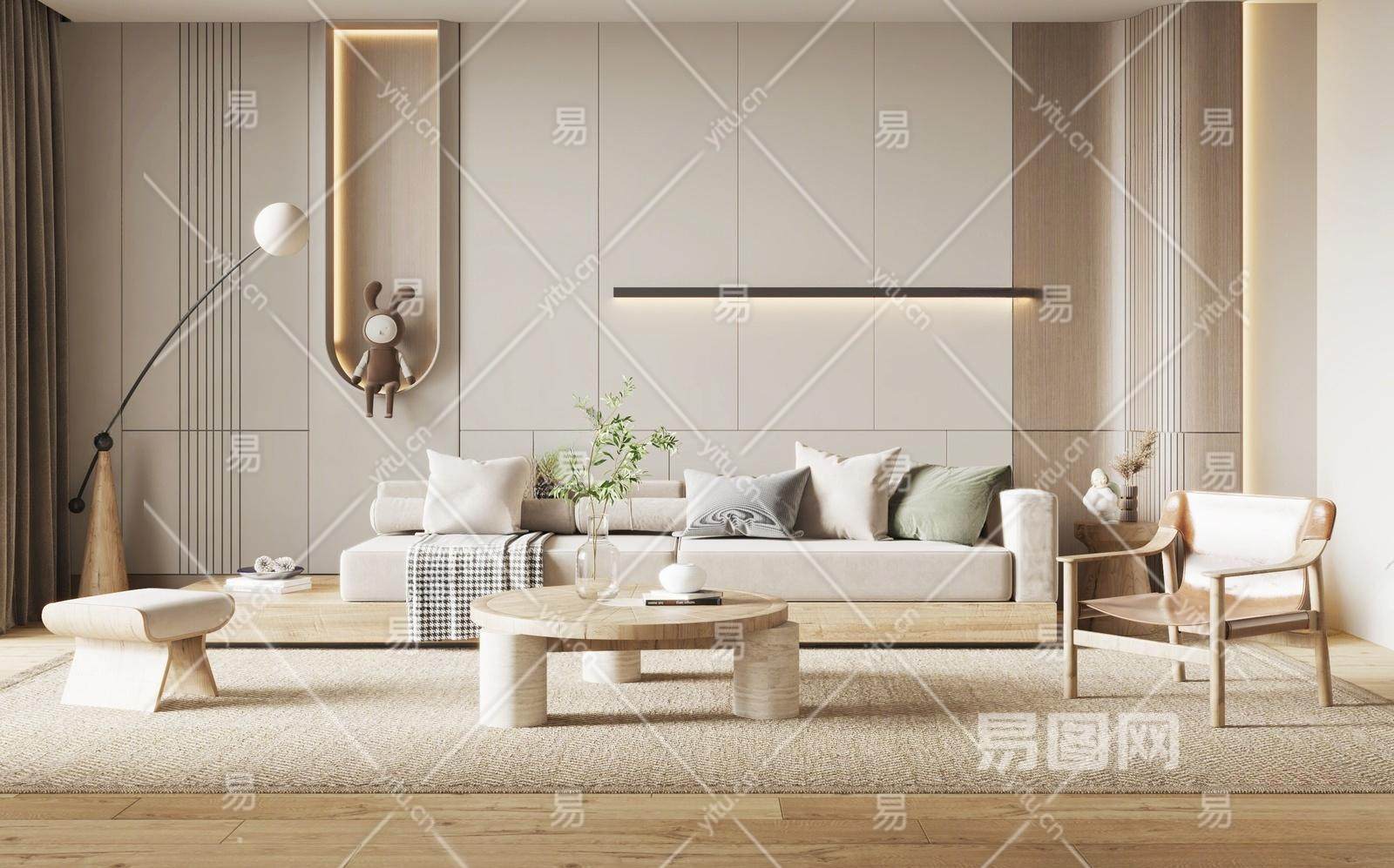 侘寂客厅 沙发茶几组合 落地灯 背景墙 绿植 休闲椅