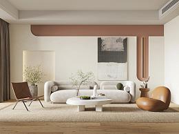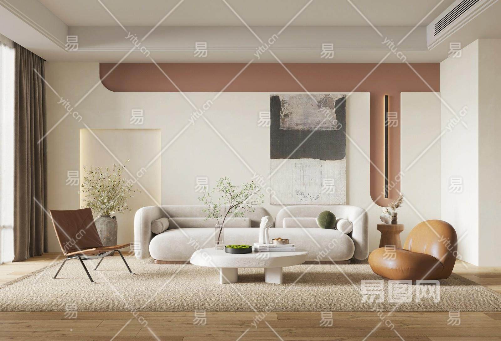 侘寂客厅 沙发茶几组合 装饰画 盆栽 花瓶 休闲椅