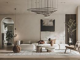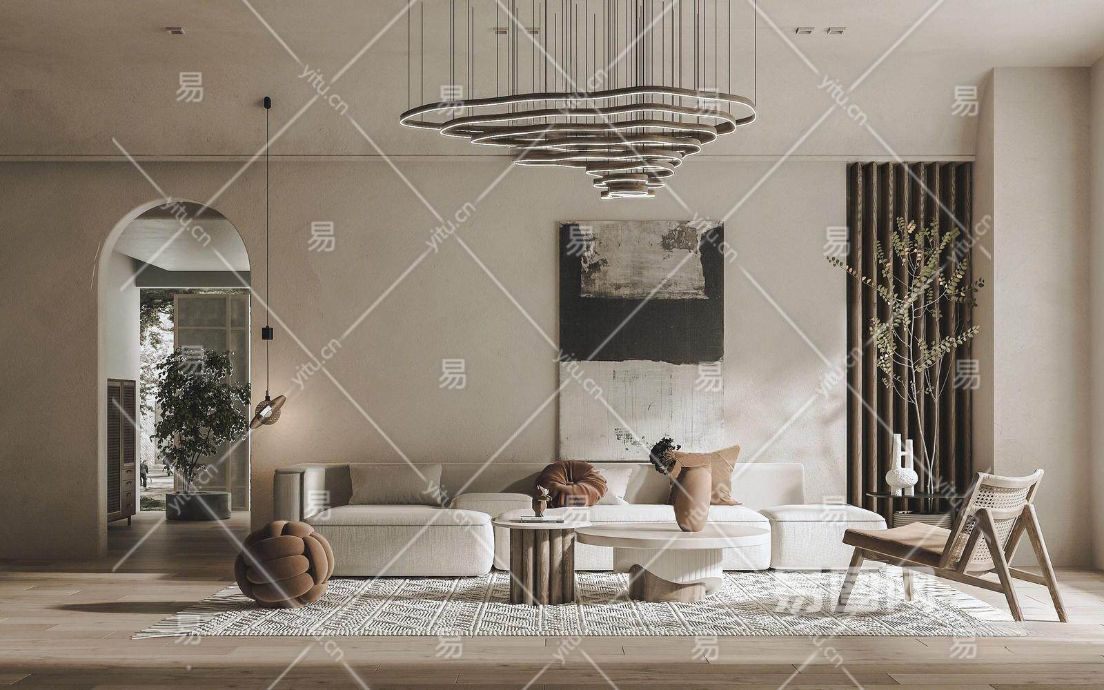 侘寂家居客厅 挂画 沙发茶几组合 地毯 休闲椅 吊灯 盆栽
