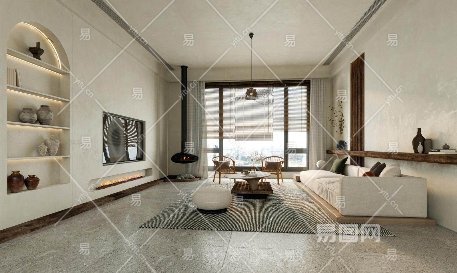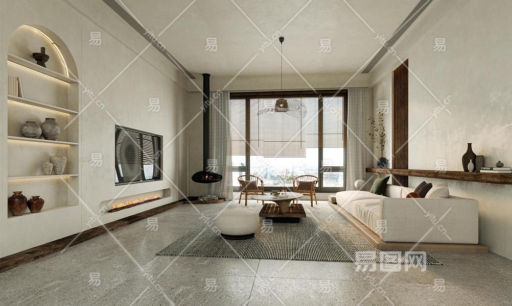 侘寂家居客厅 沙发茶几组合 壁炉 装饰品 摆件