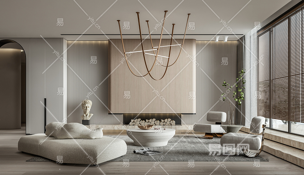 侘寂风客厅 吊灯 沙发茶几组合 雕塑装置 百叶帘