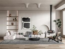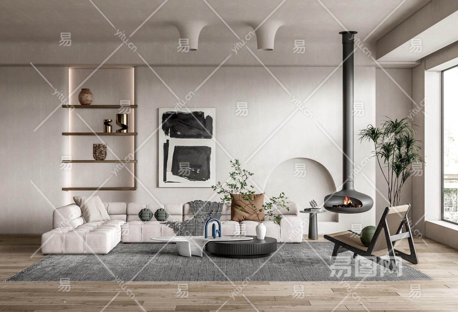 侘寂风客厅 沙发茶几组合 休闲椅 多人沙发 壁炉 绿植盆栽