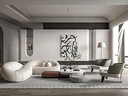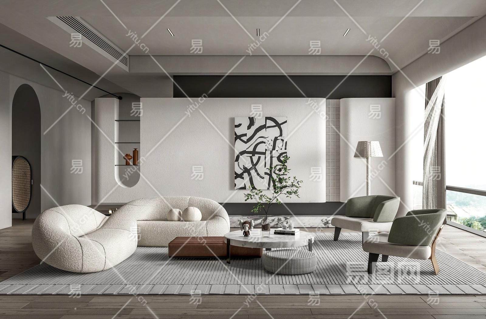 侘寂风客厅 沙发茶几组合 休闲椅 落地灯 异形沙发