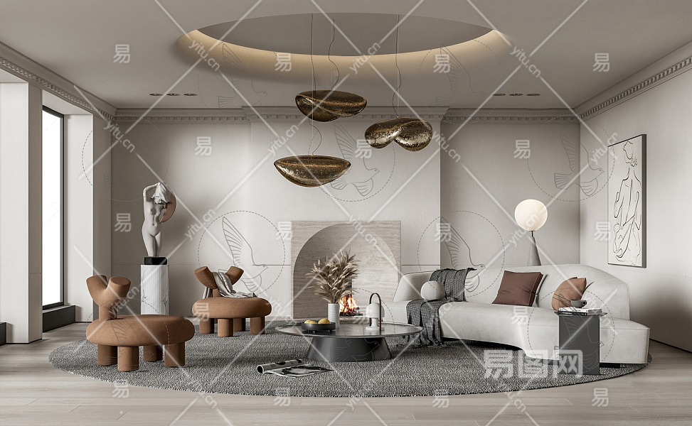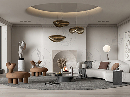 侘寂风客厅 沙发茶几组合 吊灯 休闲椅 装饰画 壁炉 落地灯 雕塑