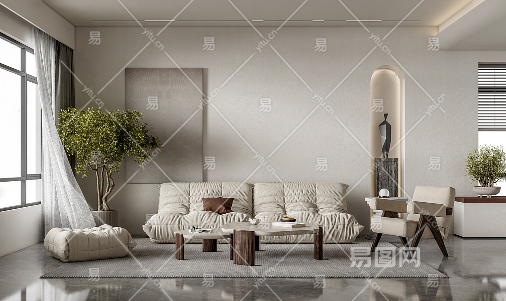 侘寂风客厅 沙发茶几组合 懒人沙发 休闲椅 盆栽