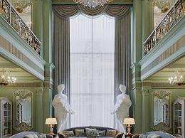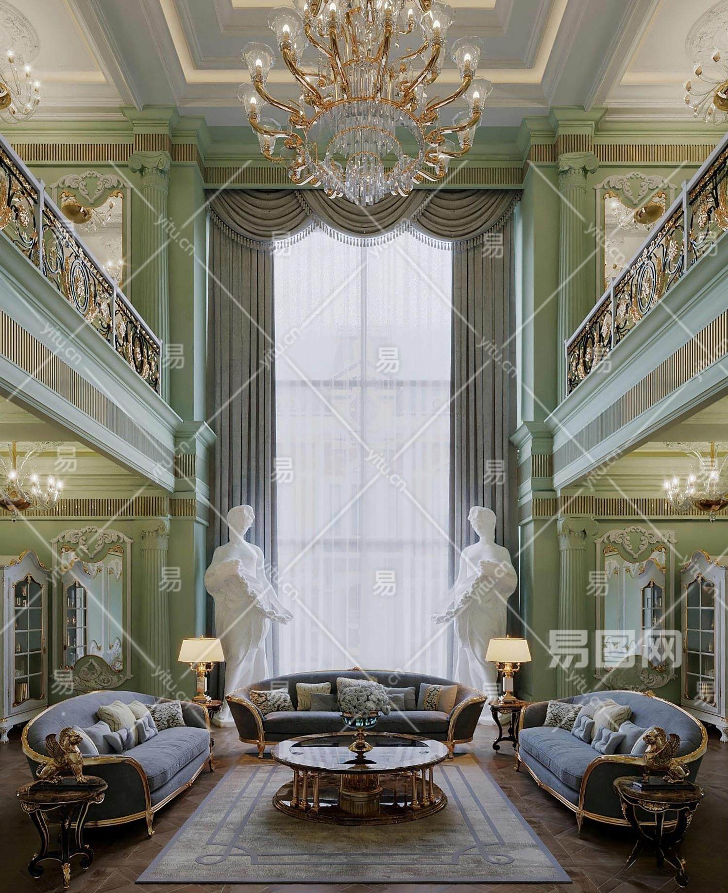 欧式复式客厅 挑高客厅 沙发茶几组合 人体雕塑 水晶吊灯