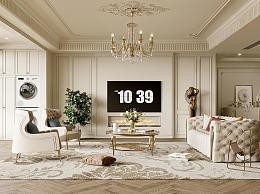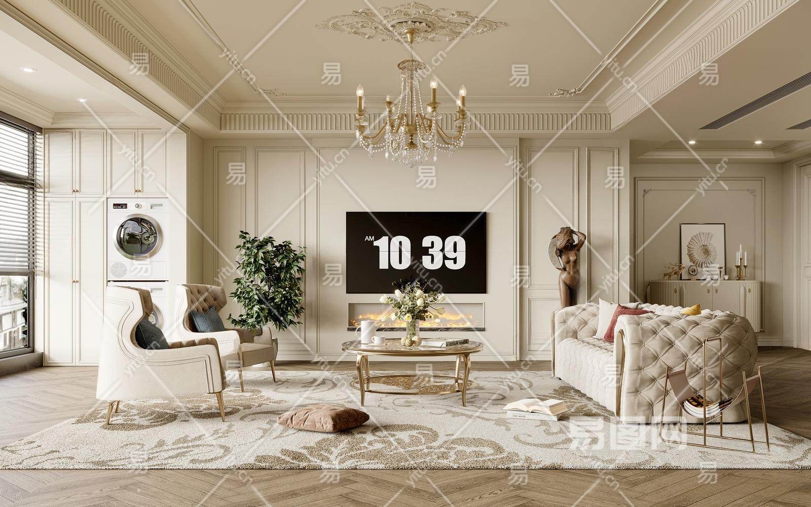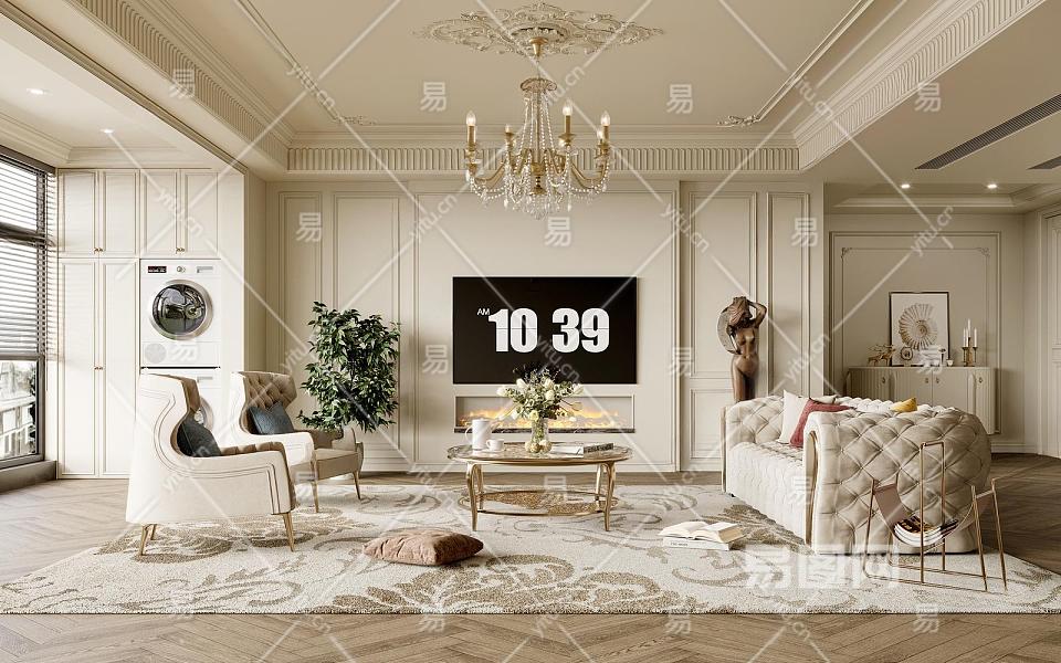欧式客厅 沙发茶几组合 吊灯 装饰柜