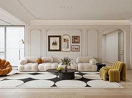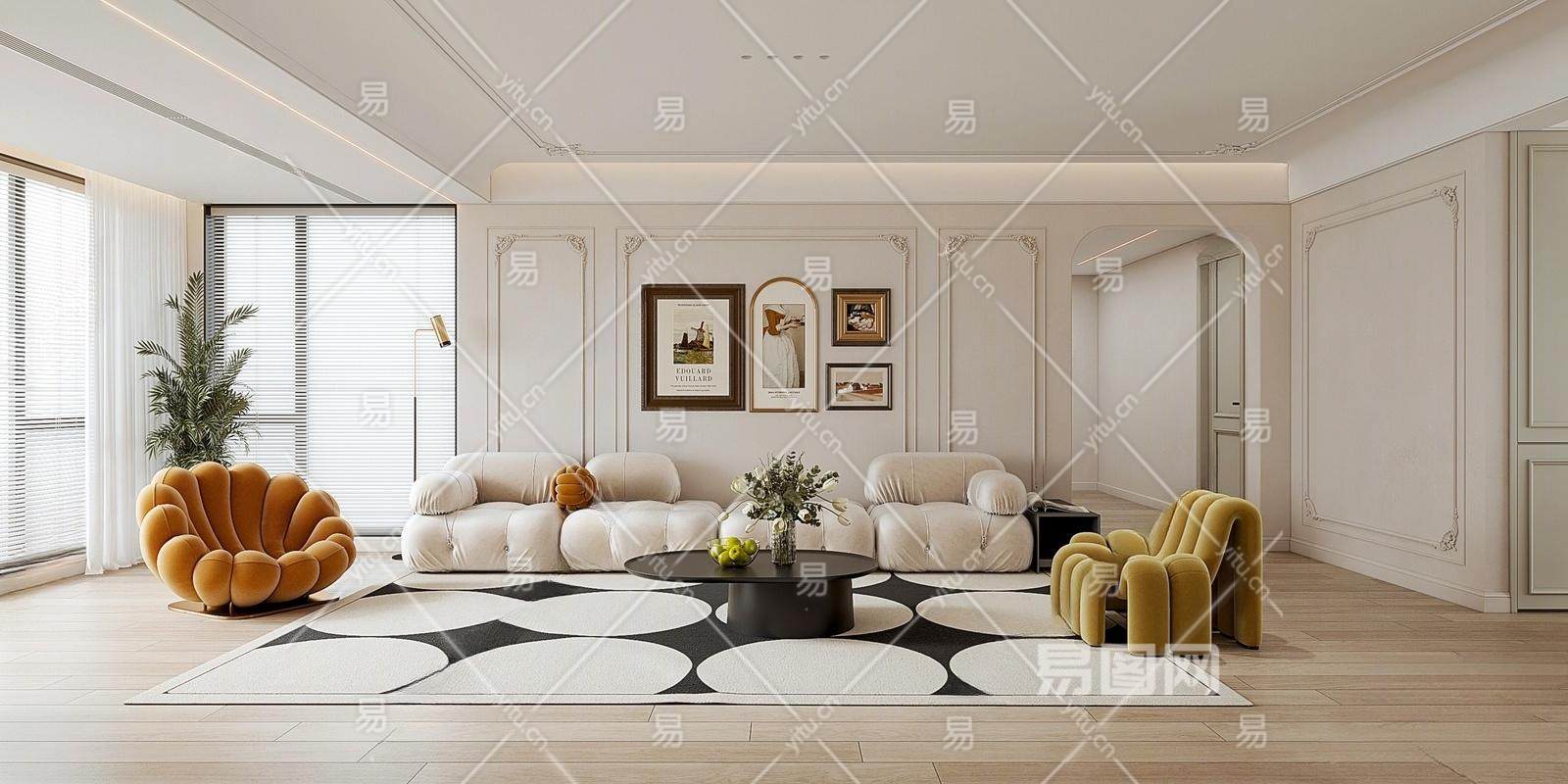 法式家居客厅 单人沙发 茶几 装饰画 绿植盆栽