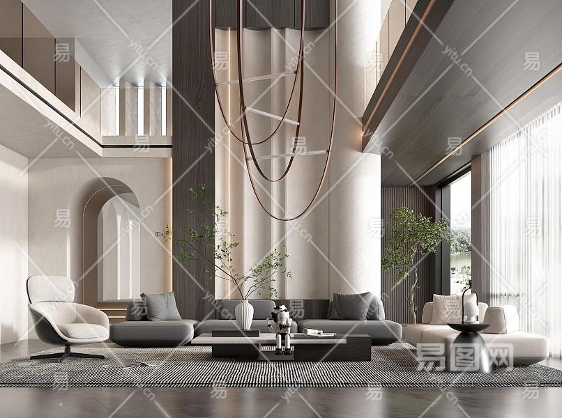 现代别墅客厅 布艺多人沙发 茶几 植物 吊灯