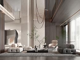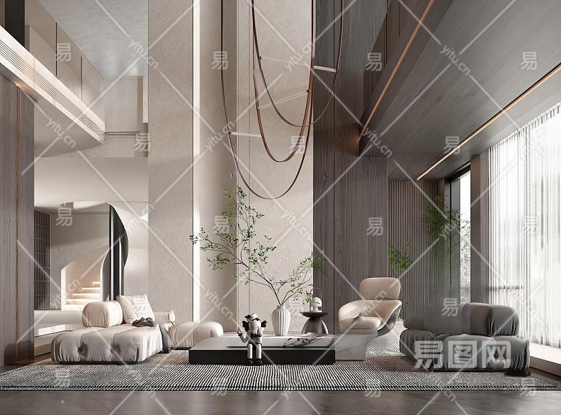 现代别墅客厅 布艺多人沙发 茶几 植物装饰 吊灯 玩偶 旋转楼梯