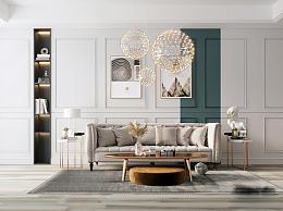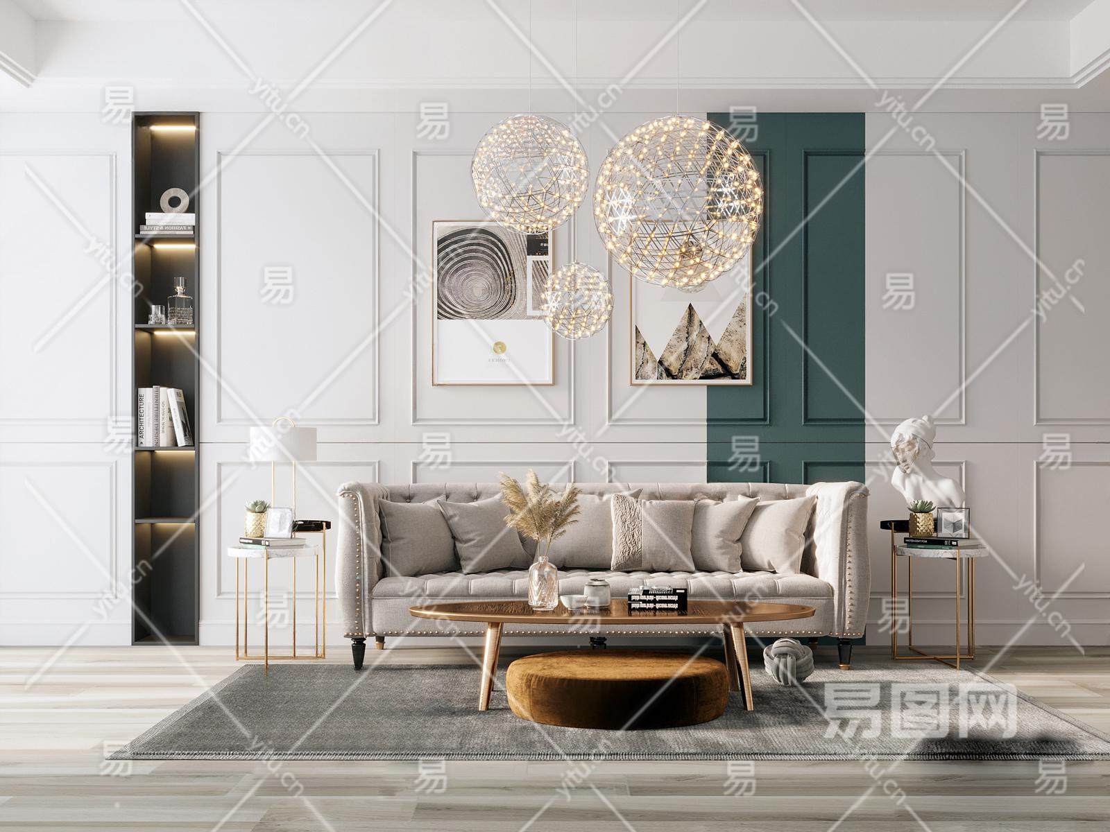 简欧客厅 多人沙发 沙发茶几组合 吊灯 装饰品 地毯 摆件