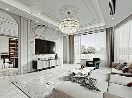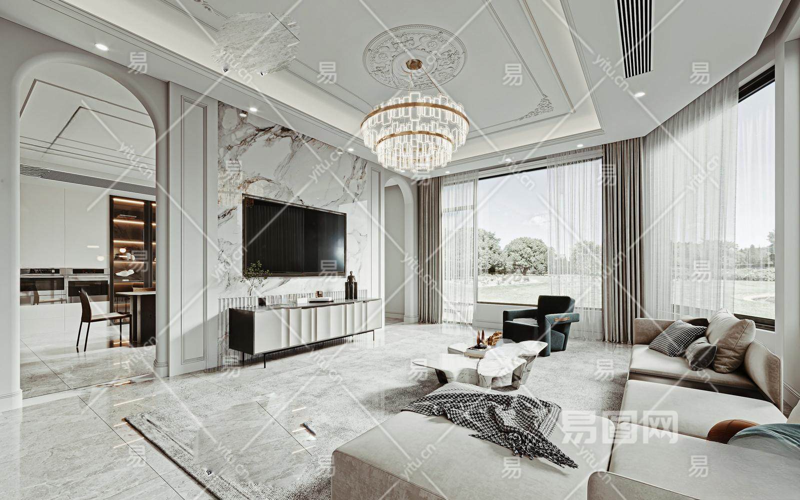简欧客厅 电视柜 水晶灯 沙发组合 茶几 单人沙发