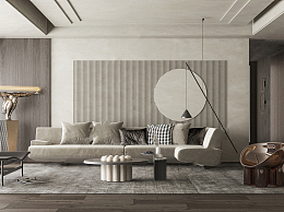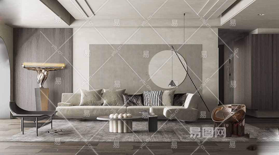 现代侘寂客厅 沙发茶几组合 休闲椅 落地灯 装饰画 摆件
