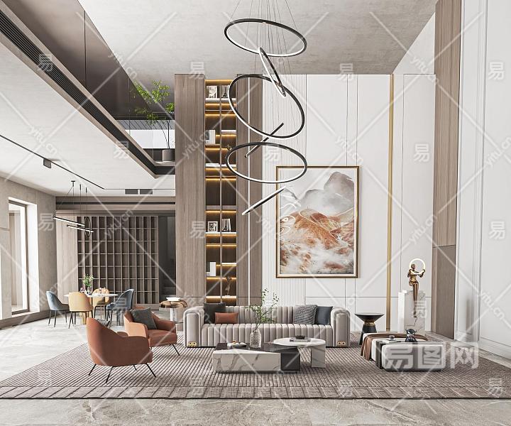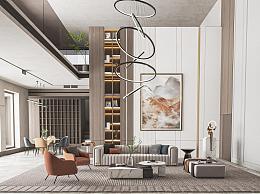 现代别墅客厅 沙发茶几 沙发背景墙 吊灯 装饰柜