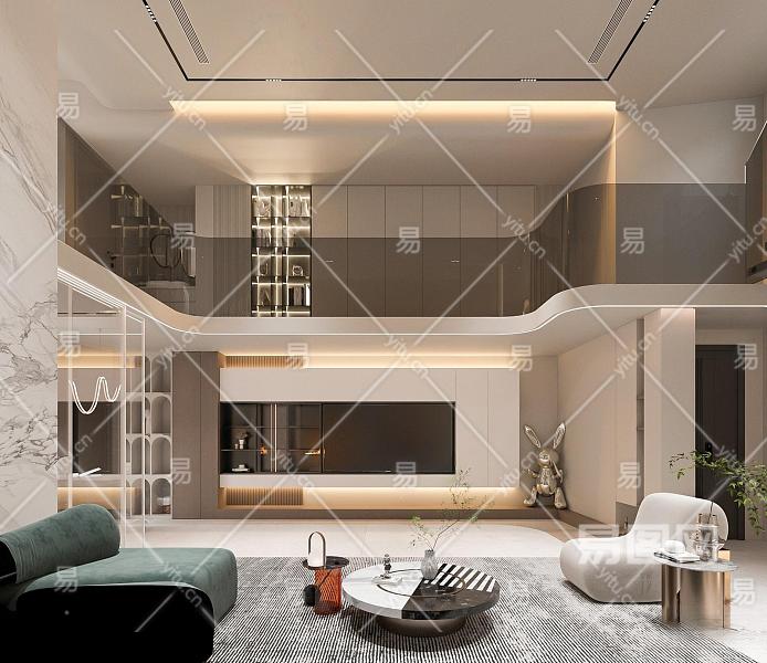 现代别墅客厅 沙发茶几组合 客厅电视背景墙 跃层别墅客厅 客厅摆件雕塑