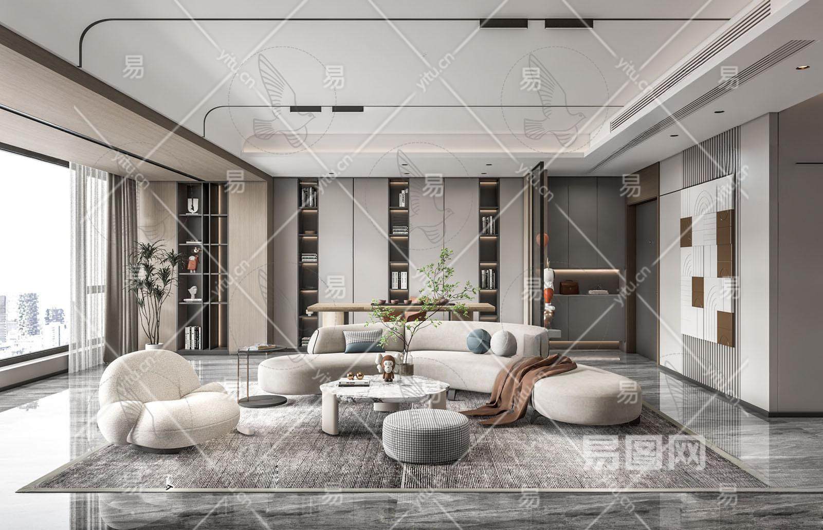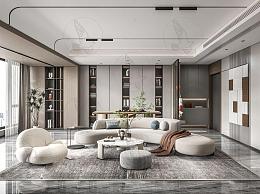 现代大平层客厅 沙发茶几组合 书桌椅 书柜 玄关 雕塑摆件 墙饰