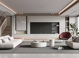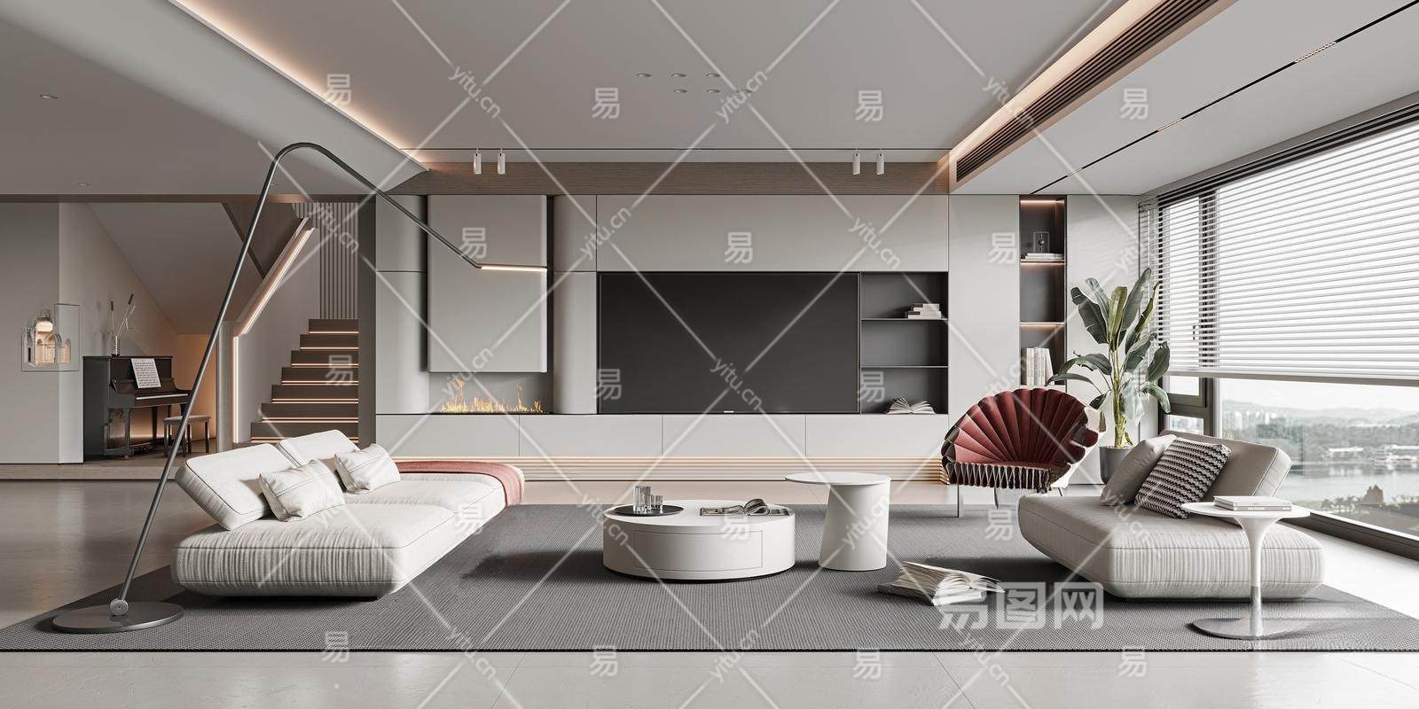 现代极简别墅客厅 极简组合沙发 茶几 单人休闲椅 电视墙 书籍 绿植
